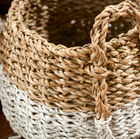 Three wicker baskets that display a bohemian countryside feel from their thick mesh and white lower half of each basket.
