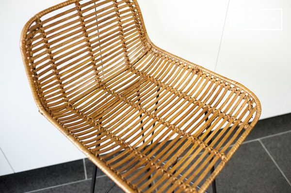 Der Sitz und die Rückenlehne dieses Barstuhls besteht ganz aus lackiertem und handgeflochtenem Rattan. Dieses Element ruht auf langen und schwarzen metallischen Füßen, deren Länge durch Ihre feine Struktur verdeutlicht wird. Die satinschwarzen Füße sind besonders elegant und bieten einen schönen Kontrast zum Rattan.